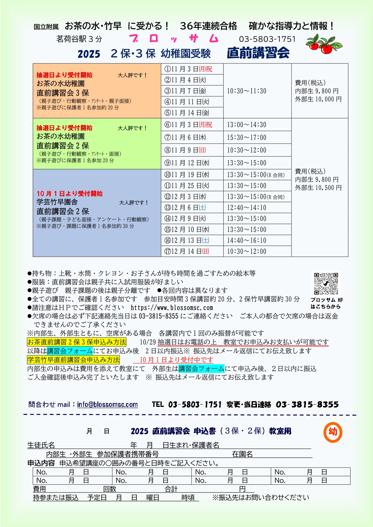 〇国立2保、3保、お茶の水幼稚園直前講習会は抽選通過者対象に11月初旬に行います。(仮日程で発表中)