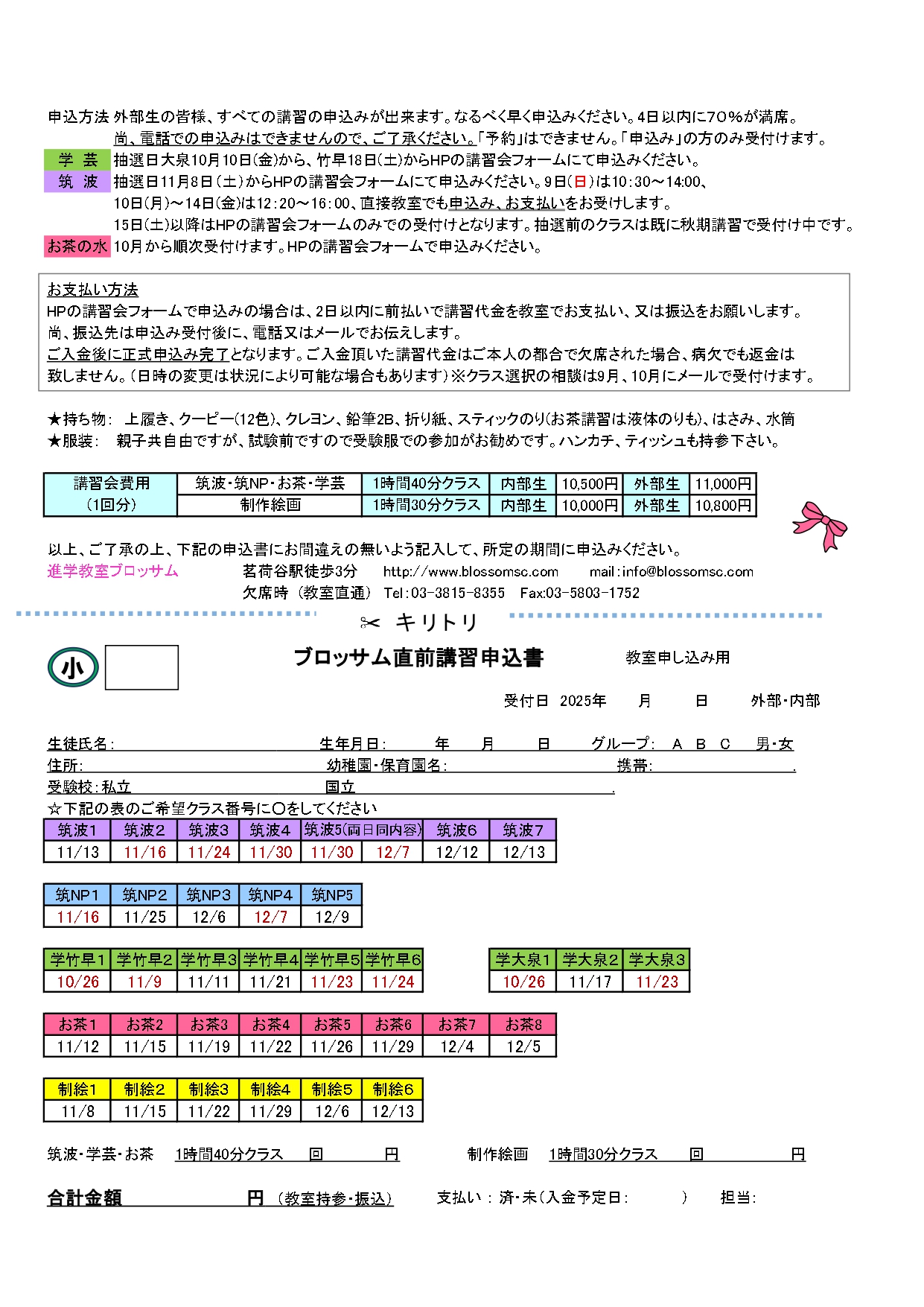 お申込方法:体験申込フォームからお申し込み下さい。または「電話(03-5803-1751)」にて、お子さまのお名前・性別・生年月日・住所・電話番号・幼稚園または保育園名・受験予定校をお知らせ下さい。